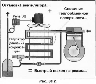 Уменьшение производительности конденсатора при одновременном применении данных методов, позволяет быстро увеличить давление конденсации в момент запуска.