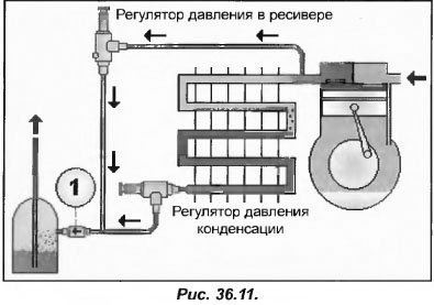 Для регулирования давления конденсации применяют установку дифференциального обратного клапана регулятора давления в ресивере, который размещают на свободной магистрали компрессора, согласно рисунку 36.11.