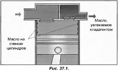 Неисправности, связанные с возвратом масла Нам уже известно, что масло, применяемое для смазки компрессоров, легко смешивается с хладагентами. Близость этих составляющих является причиной многочисленных проблем, которые вызывают как механические, так и электрические, а также термодинамические неисправности. Рассмотрим основные неисправности, которые тем или иным образом связаны с возвратом масла. Основные причины, почему масло насыщается хладагентом В смазке нуждаются все основные части поршневого компрессора (шатуны, поршни и пр), поскольку в противном случае они вызовут заклинивание, из-за сильного прижатия друг к другу. Она необходима и трущимся между собой поршневым кольцам и цилиндрам. Так, достаточно представить, что при скорости двигателя 1450 об/мин поршни совершают около 24 возвратно-поступательных движений в секунду. По этой причине внутри цилиндров должно находиться масло (вместе с хладагентом). При нормальной работе компрессора и его хорошем состоянии, постоянно из цилиндра вместе со сжатыми газами испаряется незначительное количество масла (рис.37.1). Когда компрессор остановлен, масло находится в его картере и поглощает незначительное количество хладагента. Но при его запуске, падение давления в картере провоцирует быстрое вскипание хладагента, растворенного в масле, и образуется газомасляная эмульсия. Она всасывается поршнями и попадает в конденсатор. При последующем запуске в контур попадает самое большое количество масла. |