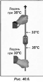 Разность температур Одной из операций, часто производимых на ощупь, является определение температуры в двух точках. Чем большая разность температур наблюдается, тем точнее будут результаты измерений. Чем меньше разница, тем сложнее «диагностировать» неисправность. К примеру, разницу в 2 К можно обнаружить используя специальную технику ощупывания. Чтобы лучше ее понять, рассмотрим задачу, когда ремонтнику необходимо проверить фильтр-осушитель, который находится на начальной стадии засорения и поэтому в нем имеется незначительный перепад температур в 2 К (температура жидкости на входе 35 С). Если на некоторое время зажать трубки руками на входе и выходе влагоотделителя, то температура каждой ладони станет равной температуре соответствующей трубки (рис.40.5). Сравнив ощущения, ремонтник сможет определить какая из них горячее. Если поменять быстро руки, можно ощутить разность в 2 К (рис.40.6). Данная техника позволяет достоверно определить даже небольшой перепад температур. |