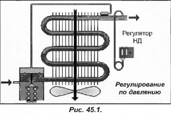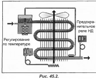 Если при остановках компрессора давление кипения быстро возрастает, то это означает, что нагнетающий клапан компрессора не полностью герметичен и есть риск повышения частоты «пуск-остановок» компрессора. Именно по этой причине для отключения компрессора сейчас используют датчик температуры в охлаждаемом объеме, а реле НД является только защитой (рис.45.2). Таким образом, метод запитки испарителя не влияет на качество регулирования.