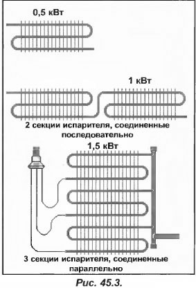 Увеличивая холодопроизводительность испарителей, длина трубок, применеяемы для их изготовления становится все большей. На рис. 45.3 показано, что для получения производительности в 1 кВт необходимо соединить две секции по 0,5 кВт. Но данная технология не получила широкого распространения, поскольку с увеличением длины трубопроводов удваиваются и потери давления. В больших испарителях такие потери давления быстро станут слишком значительными.