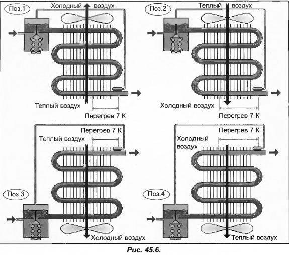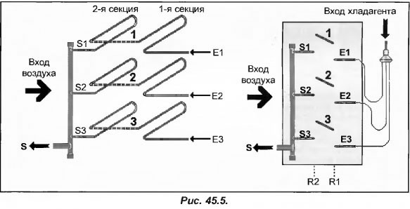В следующем, рассматриваемом нами примере, представлен более мощный испаритель, который запитан через распределитель жидкости. После того как хладагент поступил на вход секции Е, он направляется вверх в первом ряду, а во втором опускается и через выход S покидает секцию (рис.45.5). Другими словами можно сказать, что он всегда движется в направления охлаждающего воздуха. Независимо от типа используемого хладагента, он всегда и опускается и поднимается. Поэтому когда испаритель запитывается через распределитель жидкости понятие запитан сверху или снизу отсутствует.