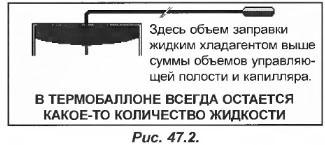 Таким образом, при наличии выбора, лучше остановиться на ТРВ с другим типом заправки. Иногда управляющие тракты ТРВ специально заправляют жидким хладагентом, который по своему количеству превышает объем управляющей полости и капиллярной трубки. При этом, если в термобаллоне всегда будет находиться жидкость, независимо от температуры корпуса ТРВ (рис.47.2) и перегрев останется нормальным. Наибольшая сложность заключается в том, что ремонтник никогда точно не может знать, каким управляющим трактом оборудован ТРВ.