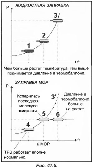 В управляющем тракте с заправкой МОР находится ограниченное количество жидкости, поскольку, когда термобаллон нагревается до определенной температуры (температура МОР) она полностью испаряется (точка 5 рис.47.5).