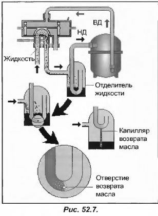 Если установка работает стабильно, то конденсатор заполнен жидкостью. Мы уже смогли убедиться, что в момент обращения цикла он становится испарителем. Это тот самый момент, когда возникает опасность попадания в компрессор большого количества жидкости, даже когда ТРВ остается полностью закрытым. Для исключения подобной опасности во всасывающей магистрали компрессора устанавливают разделитель жидкости (рис.52.7).
