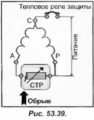 Термистор (терморезистор) подключается в сеть согласно рис.53.37. Под используемым сокращением СТР подразумевается положительный температурный коэффициент, другими словами — повышение сопротивления при увеличении температуры.