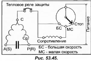Рассмотрим принципиальную схему ступенчатого регулятора скорости вращения двигателя вентилятора (рис.53.45), который устанавливают практически во всех кондиционерах. Регулирование скорости осуществляется за счет уменьшения напряжения на клеммах двигателя. Уменьшение крутящего момента приводит к снижению числа оборотов.