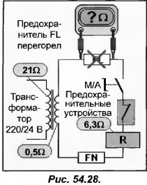 Омметр используют в тех случаях, когда электрический шкаф невозможно оставить под напряжением и необходимо выполнить полное отключение установки от сети. Для наглядности примера рассмотрим схему рис.54.28, которая запитана через трансформатор 220/24 В. Его первичная обмотка обладает сопротивлением в 21 Ом, а вторичная – 0,5 Ом, при этом сопротивление на катушке реле R составляет 6,3 Ом.