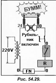 Перед подключением омметра (рис.54.29) нужно ознакомится с некоторыми опасностями данного способа. Отметим, что если схема находится под напряжением, то на концах предохранителя при включенном рубильнике напряжение составит 24 В. Если к нему подсоединить омметр, то он задымится. Поэтому лучший способом избежать серьезных ошибок — это отключить шкаф от сети.