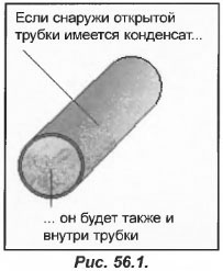 Отметим, что каждое вмешательство в работу холодильного контура (его вскрытие), является причиной проникновения в него воздуха. Поскольку в атмосферном воздухе содержаться пары воды, из-за которых возникает риск появления опасных кислот (контакт влаги с большим количеством хладагента), то попадание воздуха в контур является крайне нежелательным. Таким образом, любое вмешательство в работу контура, должно проводиться с выполнением определенных правил и требований. Осуществляя демонтаж того или иного узла для обслуживания, который снаружи покрыт конденсатом или льдом, то внутри него также начнет конденсироваться влага (рис.56.1). Количества влаги, попадающей в контур таким путем, достаточно для сгорания двигателей герметичных компрессоров (частая ошибка неопытных ремонтников).