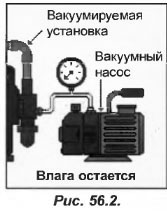Поэтому, заправляя опустошенную установку хладагентом, необходимо проверять ее на герметичность и удалять атмосферный воздух, имеющийся внутри контура. Для этого выполняют вакуумирование. Но и вакуумные насосы не способны полностью избавить от имеющейся влаги и воздуха. По этой причине после вакуумирования в контуре остается небольшое количество влаги и воздуха (рис.56.2). Объем влаги, который осталась после вакуумировании, зависит от качества вакуумного насоса, а также от времени и мастерства ремонтника.