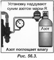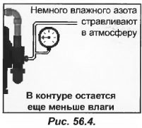 Далее хладагент стравливают в атмосферу до величины 0,1 бар (рис.56.4). Вместе с выходящим из контура азотом удаляется и часть влаги. Таким образом, после выхода из контура влажного азота, влаги внутри контура становится меньше, чем было.