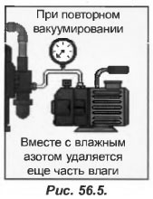 При повторном вакуумировании установки, остальная часть влажного азота будет полностью удалена (рис.56.5). После завершения повторного вакуумирования в контуре останется меньше влаги, чем было ранее (рис.56.2).