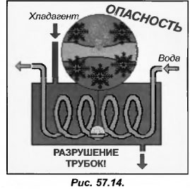 Известно, что при извлечении хладагента из холодильной установки, места, где находится жидкость, сильно охлаждаются из-за его кипения. Если в установках предусмотрены конденсаторы или испарители водяного охлаждения, то снижение температуры кипящей жидкости для них могут нести серьезные последствия. Очень велика вероятность, что вода в трубках теплообменника будет замерзать, а если это произойдет, то они разрушаться и холодильный контур станет контактировать с водяным контуром (рис.57.14).