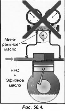 Используемые для контроля давления хладагентов комплекты манометров, должны быть различными для категорий СFC и HFC с целью исключения смешивания минерального и эфирного масла (рис.58.4).
