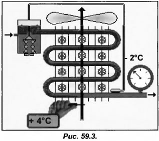 Нам уже известно, что полный температурный перепад на испарителе Δθ равен разности температур воздуха на входе в испаритель и температурой кипения То. На рис. 59.3 Δθи=+4-(-2)=6 К. При снижении температуры кипения То, температурный напор Δθи будет увеличиваться. Допустим То=-10С, тогда Δθи=+4 – (-10)=14 К.