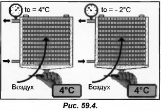 Сам по себе испаритель имеет вид длинной оребренной трубки, иногда снабженной одним или несколькими вентиляторами. Каждый испаритель имеет свои параметры, которые определяют его холодопроизводительность. В качестве примера рассмотрим два одинаковых испарителя (рис.59.4) с одинаковой температурой воздуха на входе, равной +4 С.