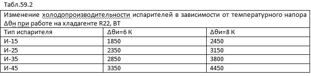 Подводя итоги, отметим, что чем больше полный температурный напор на испарителе, тем выше холодопроизводительность. Для увеличения холодопроизводительности данного испарителя необходимо увеличить температурный напор. В табл.59.2 приведены данные об изменении холодопроизводтельности четырех разных типов испарителей в зависимости от температурного напора.