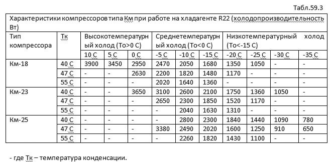 Известно, что холодопроизводительность холодильного устройства определяется величиной массового расхода хладагента по контуру. При этом на массовый расход хладагента оказывают влияние характеристики компрессора и его условия работы. В табл.59.3 отображены данные по холодопроизводительности трех типов компрессоров, согласно следующим условиям работы.
