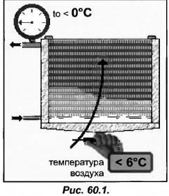 Известно, что полный температурный напор Δθи на испарителях торгового и коммерческого оборудования составляет порядка 6 К. При этом, как только температура в охлаждаемом объеме составляет менее 6 С, то температура кипения хладагента в испарителе будет отрицательной. Конденсирующиеся водяные пары на испарителе, станут инеем. Появление водяных паров в охлаждаемом объеме обусловлено выделением влаги из хранящихся продуктов и наружного воздуха. Образование инея на ребрах испарителя (рис.60.1) является причиной уменьшения теплообменной поверхности и его холодопроизводительности. При этом давление кипения начинает снижаться (испаритель еще больше покрывается инеем), а температура в охлаждаемом объеме расти. Данные факторы станут причиной для вызова ремонтника.
