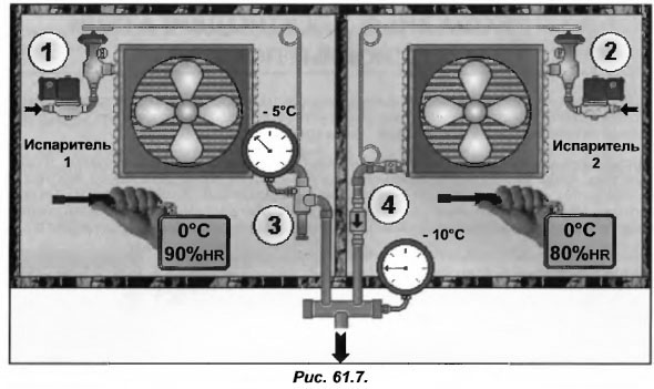 Подача жидкого хладагента в испаритель осуществляется через электромагнитные клапаны (поз.1 и 2 рис.61.7). установку клапана постоянного давления производят на выходе из испарителя, где температура кипения (поз.3) более высокая. С его помощью температура кипения t0 в первом испарителе будет поддерживаться на уровне – 5 С, что обеспечит необходимую влажность не зависимо от работы первой камеры.