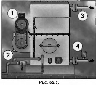Применение трехфазных двигателей позволяет регулировать количество оборотов, что очень часто применяется в воздушных охладителях. Например изменения расхода воздуха в соответствии с температурой: низкая скорость при небольшой температуре (в зимнее время) и высокая скорость при большой температуре (в летнее время). Двигателями данного типа также оснащают градирни, так на рис.65.1 представлен вариант градирни, оборудованной двухскоростным двигателем (поз.1), который приводит в действие центробежный вентилятор (поз.2).