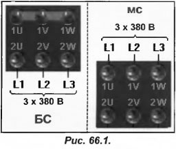 В режиме работы МС контактор МС остается замкнутым и фазы L 1, L 2 и L3 подключены клеммам МС 1U, 1V и 1W соответственно. При этом контакты БС1 и БС2 остаются разомкнутыми. Треугольник в центре (рис.66.20 означает, что между БС1 и БС2 имеется механическая блокировка, для исключения короткого замыкания фаз (при одновременном замыкании контакторов БС1 и БС2 происходит короткое замыкание).