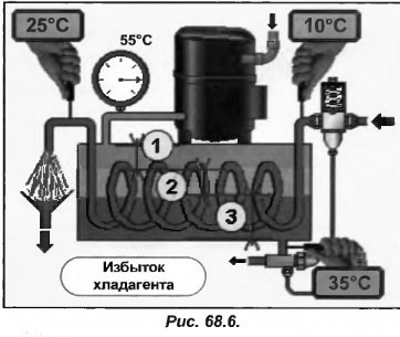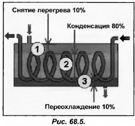 Как видно из рис.68.5, наибольший участок занят конденсирующимся хладагентом. Заметим, что количество тепла, выделяемое хладагентом в процессе конденсации, превышает в 8 раз количество тепла при перегреве (переохлаждении).