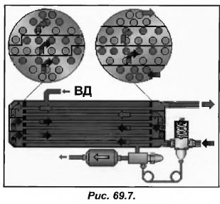 Рассмотрим шестиходовой конденсатор (рис.69.7), состоящий из 30 теплообменных трубок. Его конструкция является не совсем обычной, поскольку перегородки имеют различную конфигурацию. Если при сборке конденсатора неплотно подогнать стыки перегородок с трубными досками, то через время обнаружим, что одна часть конденсатора будет оставаться новой, а вторая покроется накипью.