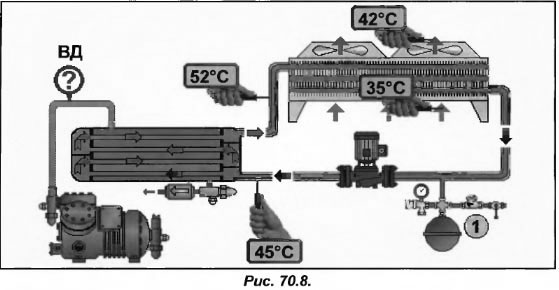 В первую очередь стоимость такого оборудования (сухая градирня + конденсатор водяного охлаждения) будет выше, чем обычного конденсатора воздушного охлаждения. Теперь рассмотрим рабочие температуры установки с сухой градирней (рис.70.8). Обратим внимание на то, что в схеме присутствует расширительный бак (поз.1).