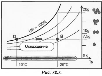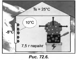 При кипении воды в кастрюле, выделяемый водяной пар постепенно будет заполнять помещение. После того, как его содержание составит 7,5 г на 1 кг воздуха, стекло запотеет. Данное явление легко объяснить. Дело в том, что контактируя со стеклом часть комнатного воздуха приобретает температуру, равную 10 С (рис.72.7). При такой температуре в воздухе может содержаться порядка 7,5 г водяных паров на 1 кг воздуха (аналогичное количество и содержится в комнате). В результате воздух становится насыщенным и на стекле появляется влага.