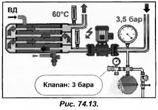Но даже при его наличии возможны неисправности, способные нанести серьезный ущерб. В связи с этим в контуре градирни предусматривают установки и предохранительного клапана (рис.74.12).