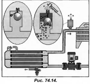 Утечка воды. При тепловом расширении давление в контуре повышается, а при утечке воды, понижается. Из-за разностей уровней самое высокое давление в контуре находится в самой нижней его точке. Исходя из этого, самое низкое давление будет отмечаться в верхней его точке. Но если оно окажется ниже атмосферного, то через дренажный клапан в контур попадет наружный воздух (рис.74.15). При его попадании расход жидкости в гидравлическом контуре снизится и потребуется совершить множество процедур, чтобы привести контур в работоспособное состояние.