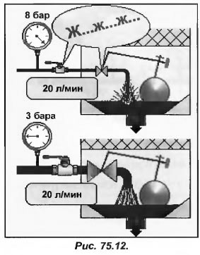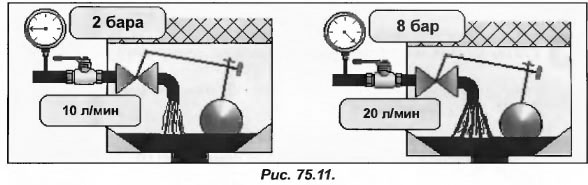 Известно, что поплавковый клапан служит для подачи водопроводной воды в бак градирни (рис.75.11). Теперь представим, что клапан полностью открыт (давление воды в сети 2 бара), что обеспечивает расход 10 л/мин. Для того чтобы расход через клапан увеличить до 20 л/мин, давление в водопроводной сети должно повыситься в 4 раза.