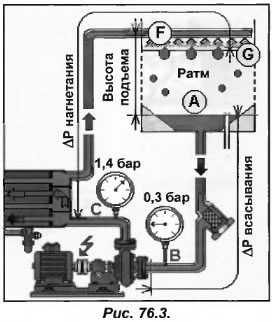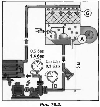 Таким образом, сумма потерь давления в подающей части контура (от точки С до точки G) вместе с высотой подъема (с уровня А на уровень F) должны составлять 0,9 бар. Полные потери давления на нагнетании ΔРнагн=0,9 бар.