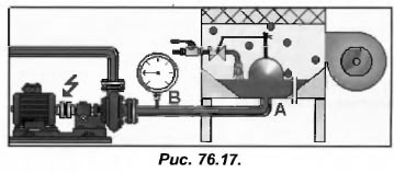 Данная ситуация может возникнуть, когда насос установлен на том же уровне, что и градирня (рис.76.17). Когда насос выключен, давление в точке В соответствует высоте уровня воды в баке, равной 0,5 м или 0,05 бар. С учетом того, что участок А-В небольшой, с включением насоса потери на нем будут малы, а давление в точке В останется почти неизменным и будет немного выше атмосферного.