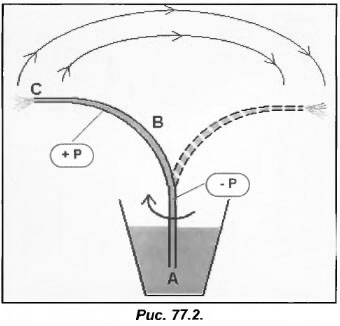 Для лучшего представления о работе центробежного насоса возьмем гибкий шланг и опустим его в емкость с водой (рис.77.2). Если шланг начать быстро гнуть в противоположные стороны, согласно рисунку, то возникнет центробежная сила и жидкость начнет разбрызгиваться от точки А к точке В. Находясь в точке С, вода выплескивается под давлением, что получило название «эффект пращи». Чем больше длина шланга, тем он больше изгибается, центробежная сила возрастает и давление в точке С становится большим. Сила, используемая в центробежном насосе, основана именно на таком явлении.