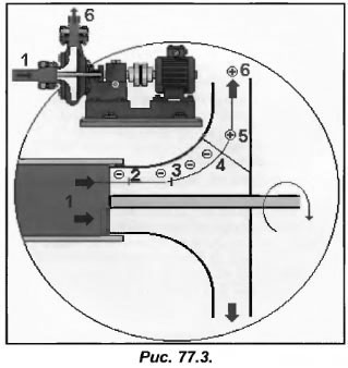 Во время работы насоса, вода проходит по крыльчатке и ее давление меняется. Во время всасывания между точками 1 и 4 (рис.77.3) лопатки крыльчатки создают разряжение. Далее вода двигается перпендикулярно оси насоса и находится под давление центробежной силы между точками 5 и 6. Под данным давление вода выходит из крыльчатки насоса в точке 6. При увеличении диаметра крыльчатки и ее скорости вращения центробежная сила будет возрастать вместе с давлением в точке 6.
