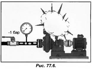 Известно, что при высокой температуре воды и низком ее давлении на входе в насос, возникает риск возникновения кавитации. Давление на входе в крыльчатку снизится, если забит фильтр или перекрыт вентиль на входе в насос. Оно станет меньше атмосферного и даже при температуре воды в 20 С, возникнет риск кавитации (рис.77.6). Не стоит включать насос при закрытом вентиле, поскольку это может вывести его из строя.