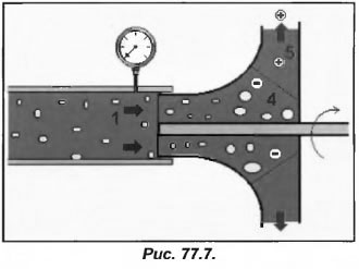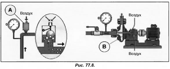 Мы уже наблюдали за тем, как давление воды на крыльчатке от точки 1 до точки 4 снижается (рис.77.7). Это приводит к выделению из воды воздуха. Количество воздушных пузырьков увеличивается, образуя более крупные, которые направляются к выходу из крыльчатки в зону 5. Давление увеличивается, пузырьки уменьшаются в объеме и содержащийся в них воздух вновь растворяется в воде. Постоянные изменения объемов пузырьков, также как и кавитация, являются причиной возникновения гидравлических гидроударов, возникают шумы, снижается расход, что приводит к коррозии и быстрому износу оборудования.