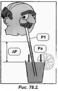 Чтобы лучше понять принцип всасывания жидкости возьмем стакан сока и начнем его пить при помощи трубочки (рис.78.2). В процессе всасывания сок поднимется по соломинке и оказывается у нас во рту. Как это происходит?