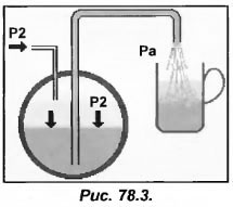 Рассмотрим схему (рис.78.3) объясняющую подачу пива из бочки в бокал. Для этого газ подается внутрь бочки под давлением Р2, которое выше атмосферного (порядка 2 бар). Наружное атмосферное давление составляет Ра=1 бар. Благодаря перепаду давлений ΔР=Р2-Ра пиво наполняет бокал.