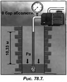 Теперь рассмотрим установку, насос которой подымает воду из колодца (рис.78.7). На воду в колодце действует атмосферное давление и насос, погруженный в воду, создает разряжение для создания давления, которое поднимает воду вверх. Если насос создаст давление равное абсолютному нулю (что невозможно) вода поднимется только на 10 м. даже при создании насосом абсолютного вакуума, вода не поднимется выше 10,33 м.