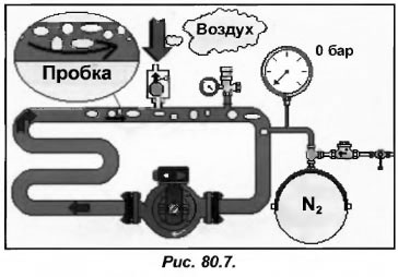 По причине того, что воздух намного легче воды, его пузырьки постоянно скапливаются в верхних точках контура, образуя полости через которые необходимо проходит циркулирующей по контуру воде. Они могут следовать за водой, с ней перемешиваться, и в результате мы слышим характерный звук, который не следует путать с шумом (гудением) возникающим при кавитации. Наличие воздушных полостей приводит к снижению расхода и прочим неисправностям. Встречаются случаи, что расход воды в трубопроводе может оказаться нулевым. Так, избыточное количество воздуха в гидравлическом контуре является причиной образования воздушных пробок (рис.80.7).