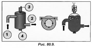 Помимо этого в гидравлическом контуре должен присутствовать воздухосборник (рис.80.9). Вода в него поступает сверху (поз.1), а выходит снизу (поз.2). В верхней части воздухосборника устанавливают автоматический дренажный клапан, а в нижней части расположена съемная пробка (поз.4). Поскольку вода из воздухосборника выходит из нижней части, то вероятность попадания воздуха очень низкая.