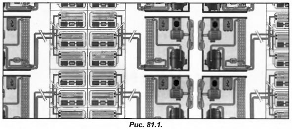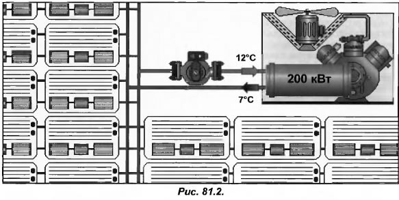 В каждом помещении необходимо разместить по кондиционеру, которых в общей сложности может насчитываться несколько сотен (рис.81.1). Однако обслуживать такое количество кондиционеров неудобно и, к тому же, неэстетично (когда здание будет полностью обвешано кондиционерами). Установив холодильную машину, на крыше здания или рядом, потребуется, чтобы испарители находились внутри помещения, что, в свою очередь, повлечет за собой строительство большого количества трубопроводов. При данном исполнении потери будут просто огромными, и к тому же довольно сложно будет бороться с утечками, а также возникнут и другие проблемы.