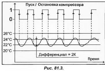 Если компрессор обычного кондиционера выключен, то воздух, проходящий через испаритель, не будет охлаждаться. При его запуске, холодопроизводительность испарителя становится максимальной и воздух быстро охлаждается. Однако для поддержания заданной температуры любые колебания являются неприемлемыми (рис.81.3).