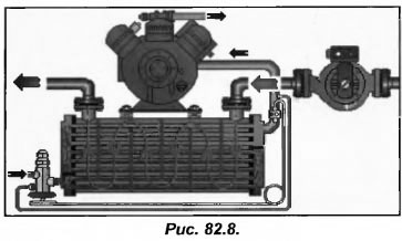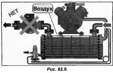 Потери давления в кожухотрубных испарителях могут быть довольно существенными. В некоторых моделей испарителей они составляют 4 м вод. ст. При установке насоса на выходе из испарителя, давление в нем становится низким (рис.82.9). Это способствует выделению воздуха, находящегося в воде, и повышает опасность появления воздушных пробок. Из-за них расход воды становится меньшим, а в некоторых случаях может начаться кавитация насоса.