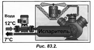 Δtисп возд=26 С-16 С=10 К, а по воде (рис.83.2) на испарителе Δtисп воды=12 С – 7 С=5 К.